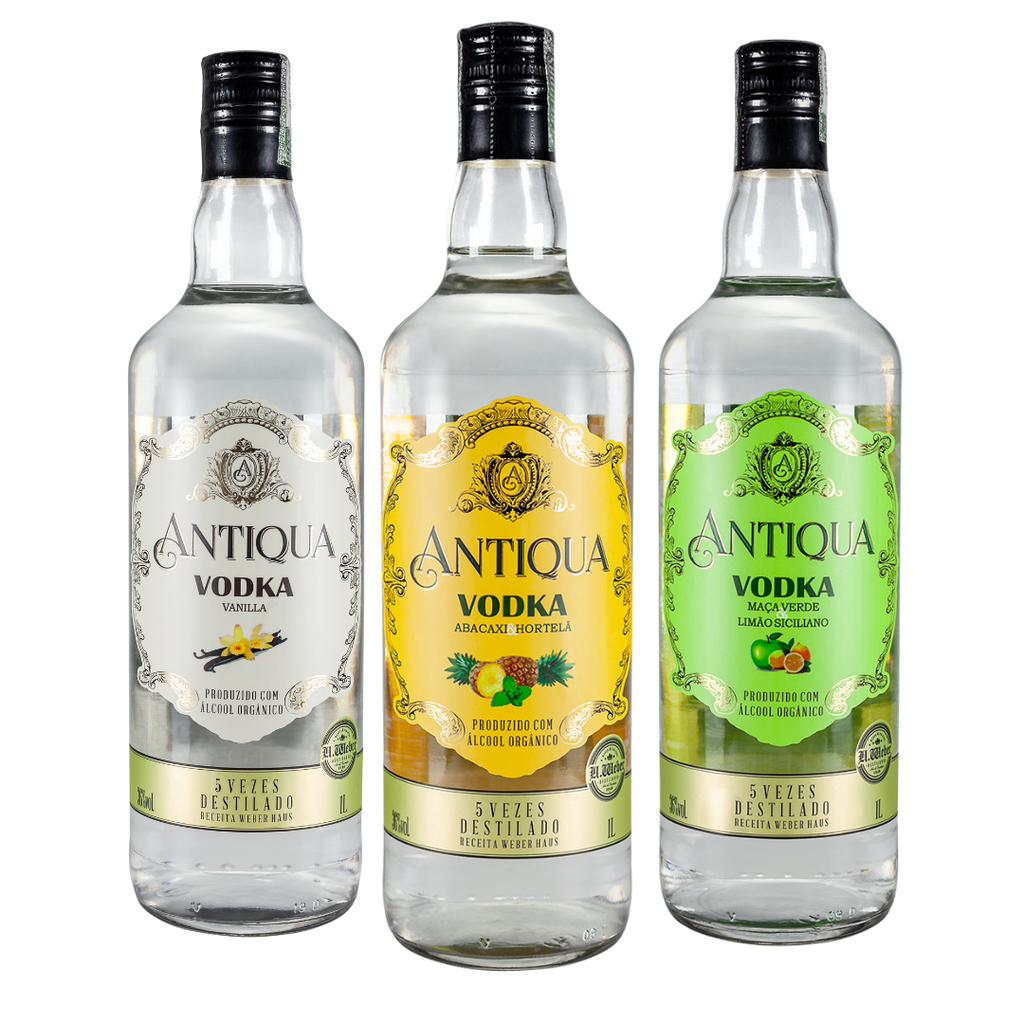 O Combo Vodka Antiqua, traz uma seleção especial que reúne três sabores distintos e inovadores: maçã verde e limão siciliano, abacaxi com hortelã e baunilha.