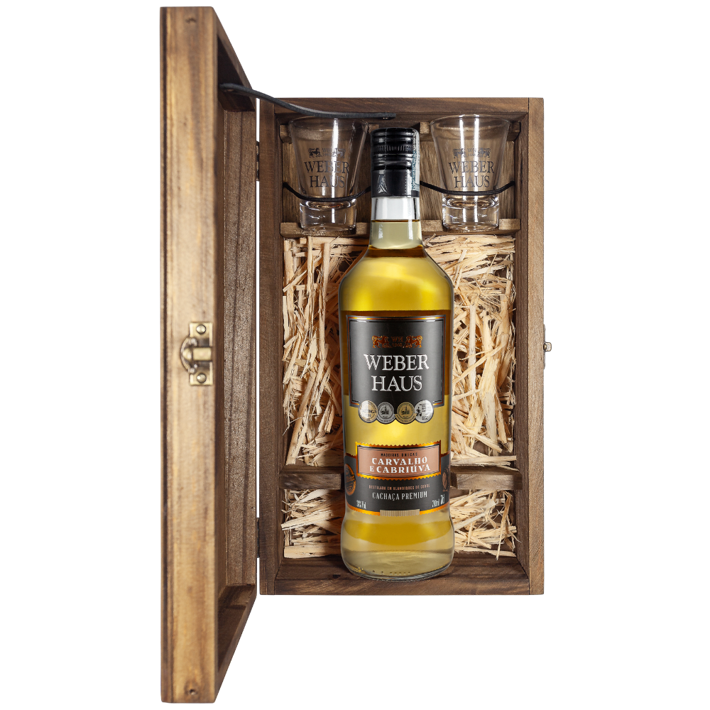 Este conjuntode Estojo com Cachaça Orgânica Weber Haus e 2 Copos vem acompanhado de uma garrafa de Cachaça Weber Haus 700ml, com a possibilidade de escolha entre quatro versões exclusivas, cada uma envelhecida em madeiras nobres que adquirem aromas e sabores únicos.